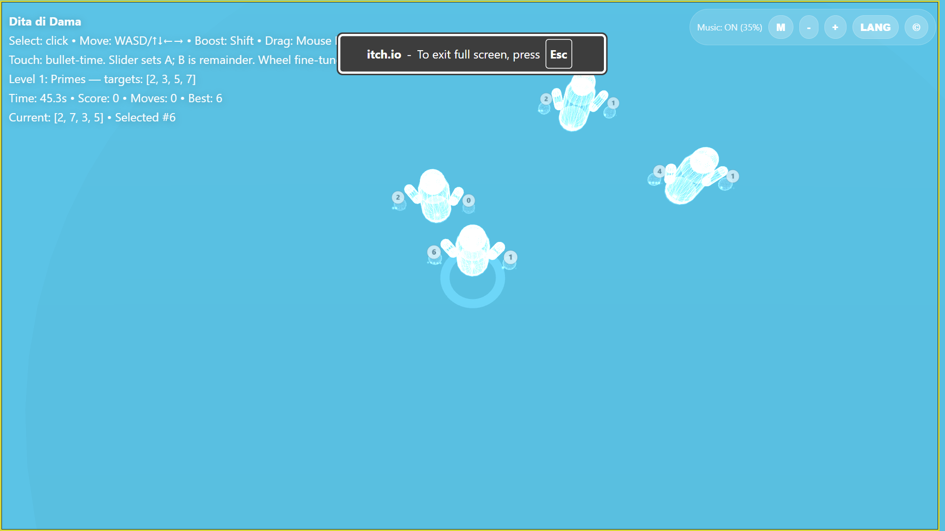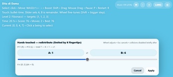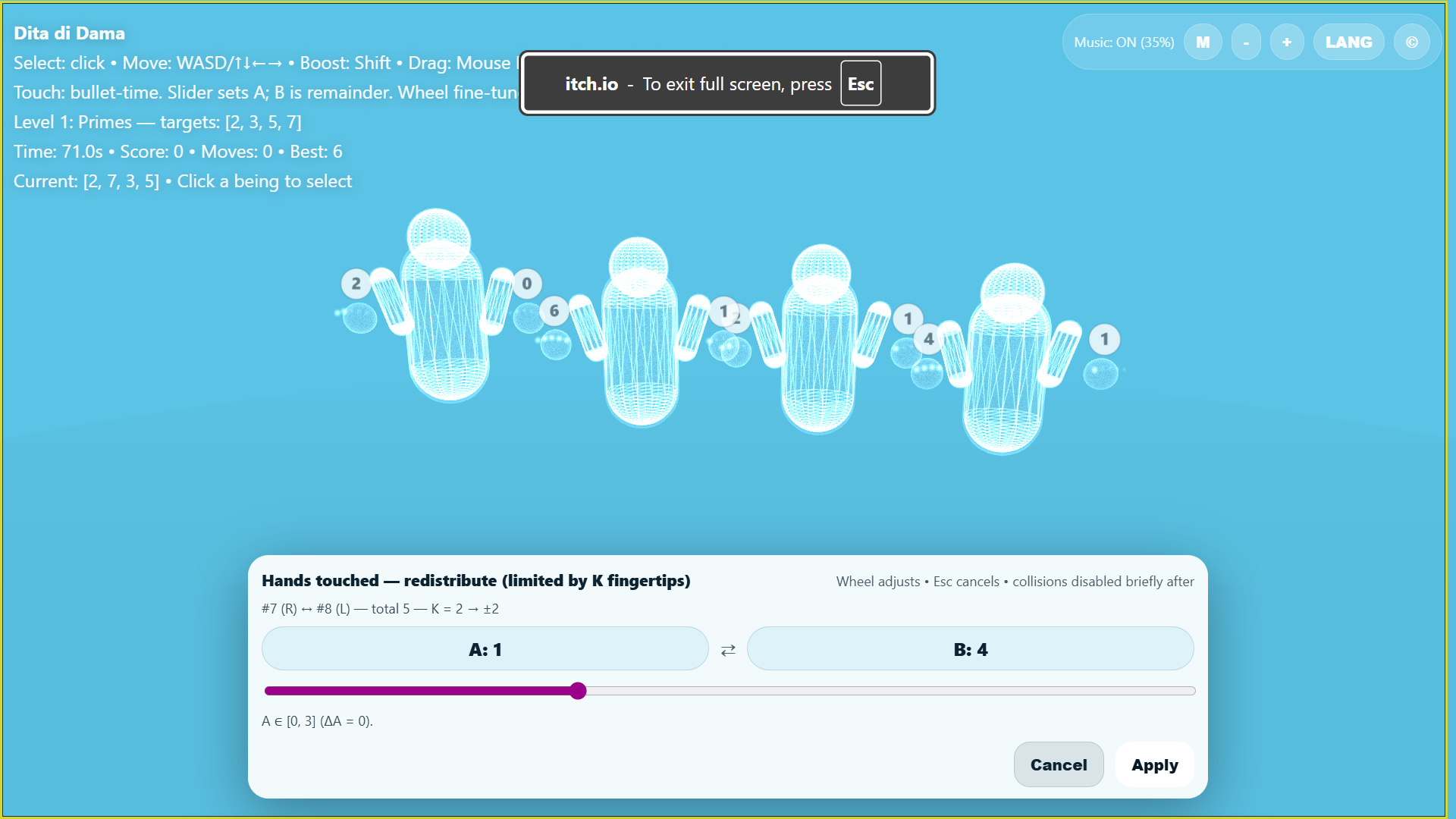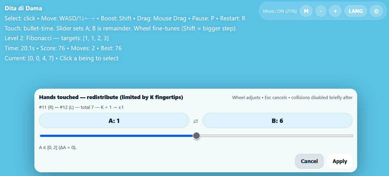 Dita di Dama is a dreamlike 3D puzzle game: guide translucent, X-ray-like beings in space, make fingertips touch, and redistribute finger counts to build target sequences under time pressure.